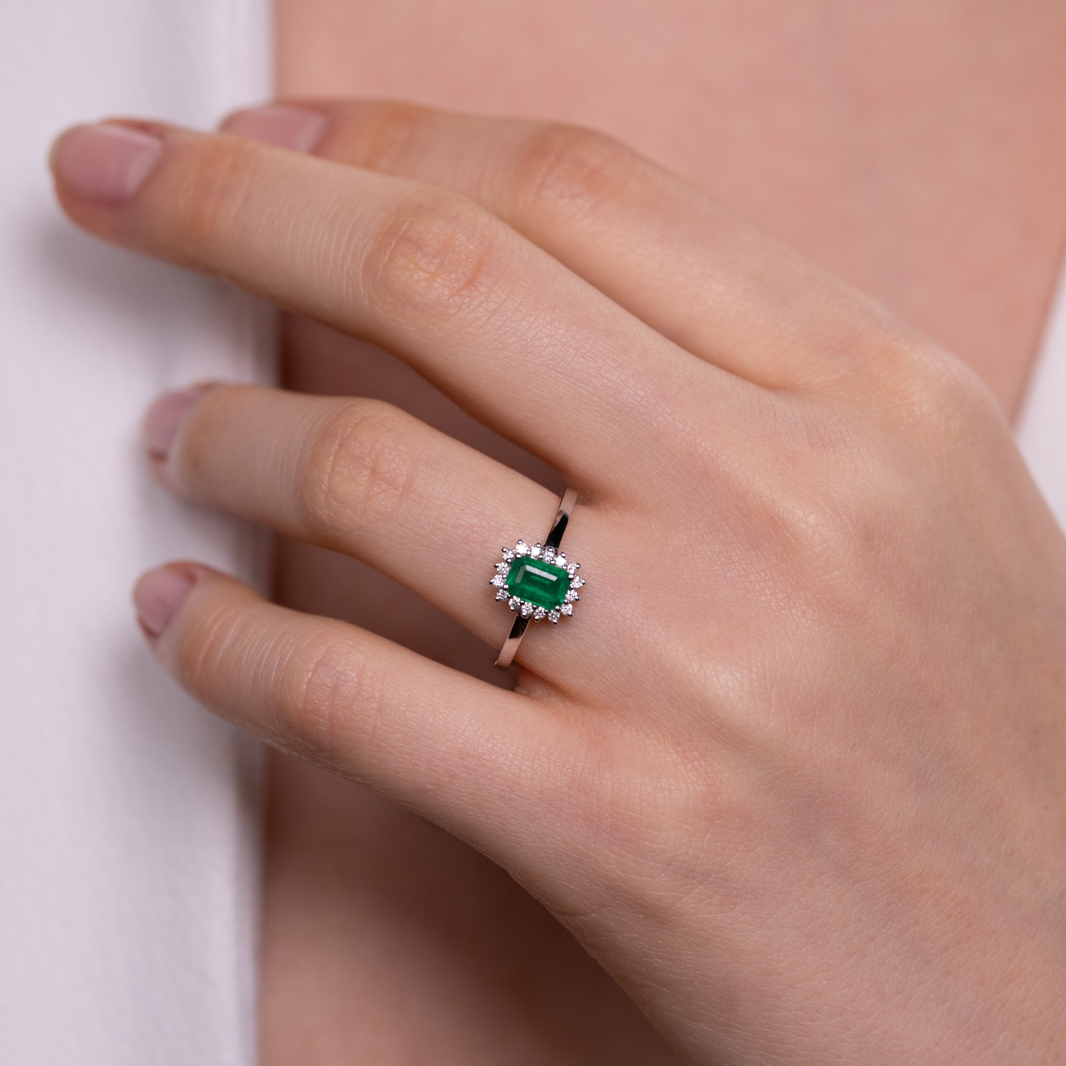 Realizat in aur de 18k, 2.66 gr cu diamante de 0,14 ct si smarald central de 0.69 ct.