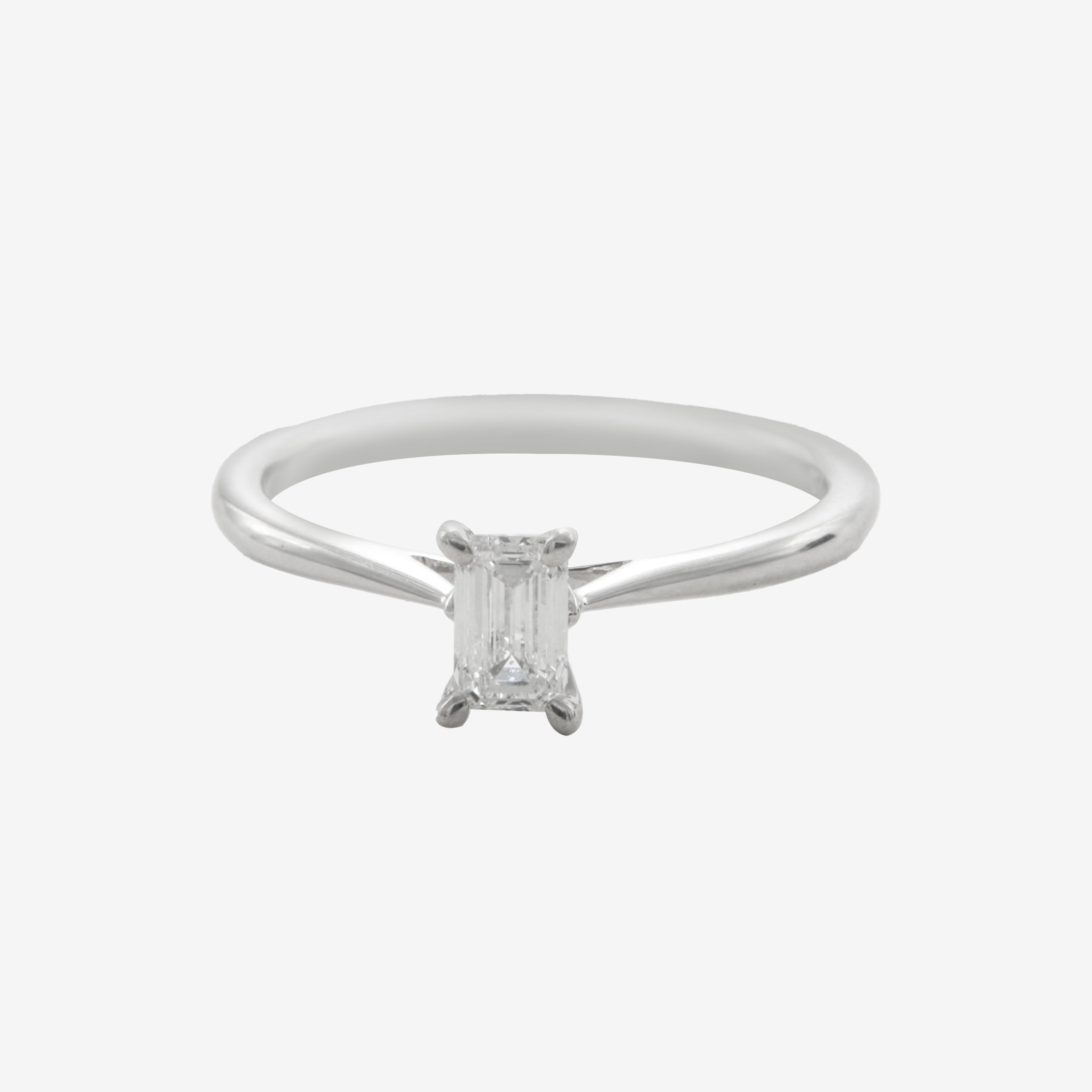 Realizat in aur de 18k, 2.21g, cu diamant central emerald cut 0.41 ct, culoare E si claritate VS1, insotit de certificat gemologic GIA.