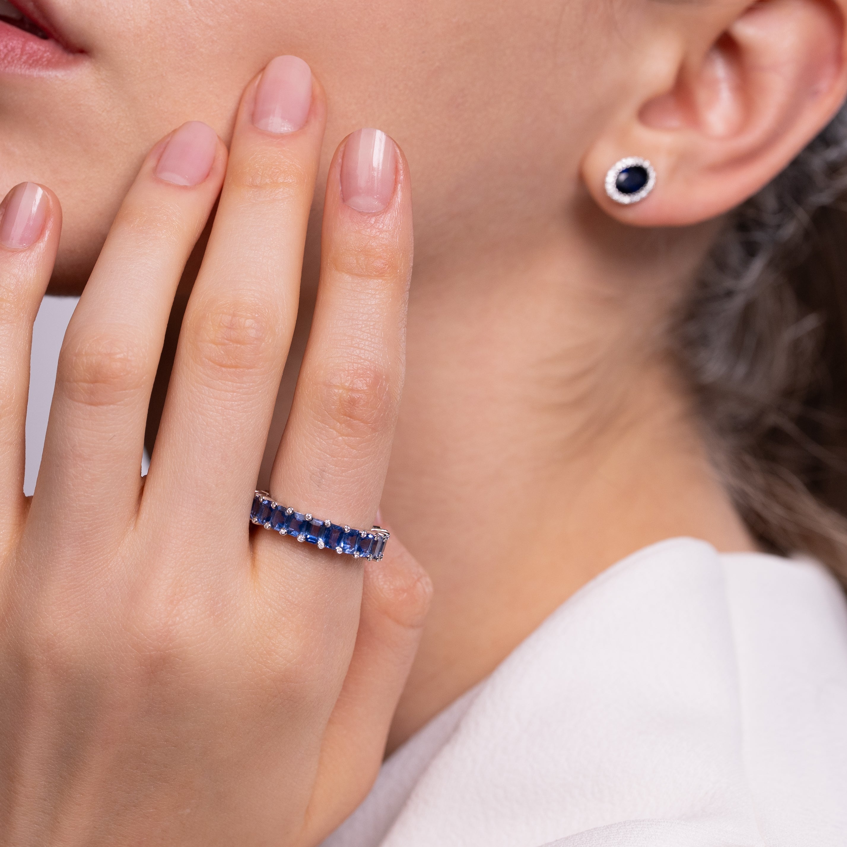 Acest inel clasic inconjoara degetul cu un rand stralucitor de safire, si se potriveste perfect oricarei tinute.